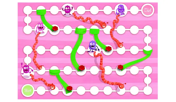 Landet der Spieler auf einem Feld mit einem lilafarbenen Virus, muss er die abgebildete Raupe bis zu ihrem Kopf herunterrutschen. Der nächste Spieler ist an der Reihe. Achtung: Die Spieler dürfen die Schals und Raupen nicht in die andere Richtung benutzen.